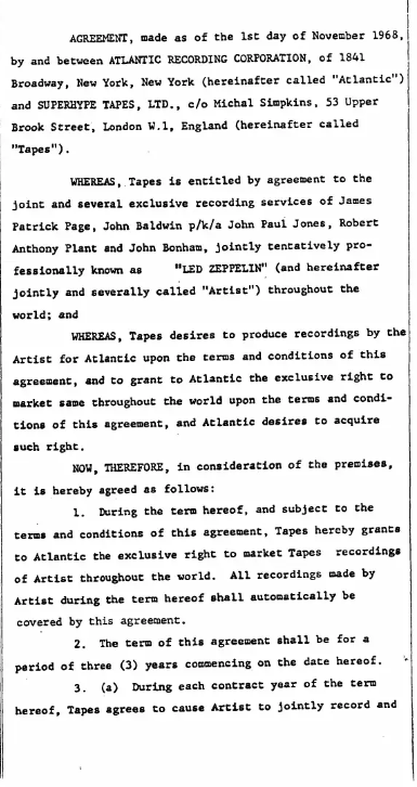 Ce document original retrouvé par le site d’information non officiel sur Led Zeppelin "LedZepNews", comprend plusieurs clauses parmi lesquelles il en existe une qui pourrait surprendre les fans. Il semble que l’une des clauses donne le choix à Jimmy Page, de remplacer ou non Robert Plant, John Paul Jones et John Bonham.